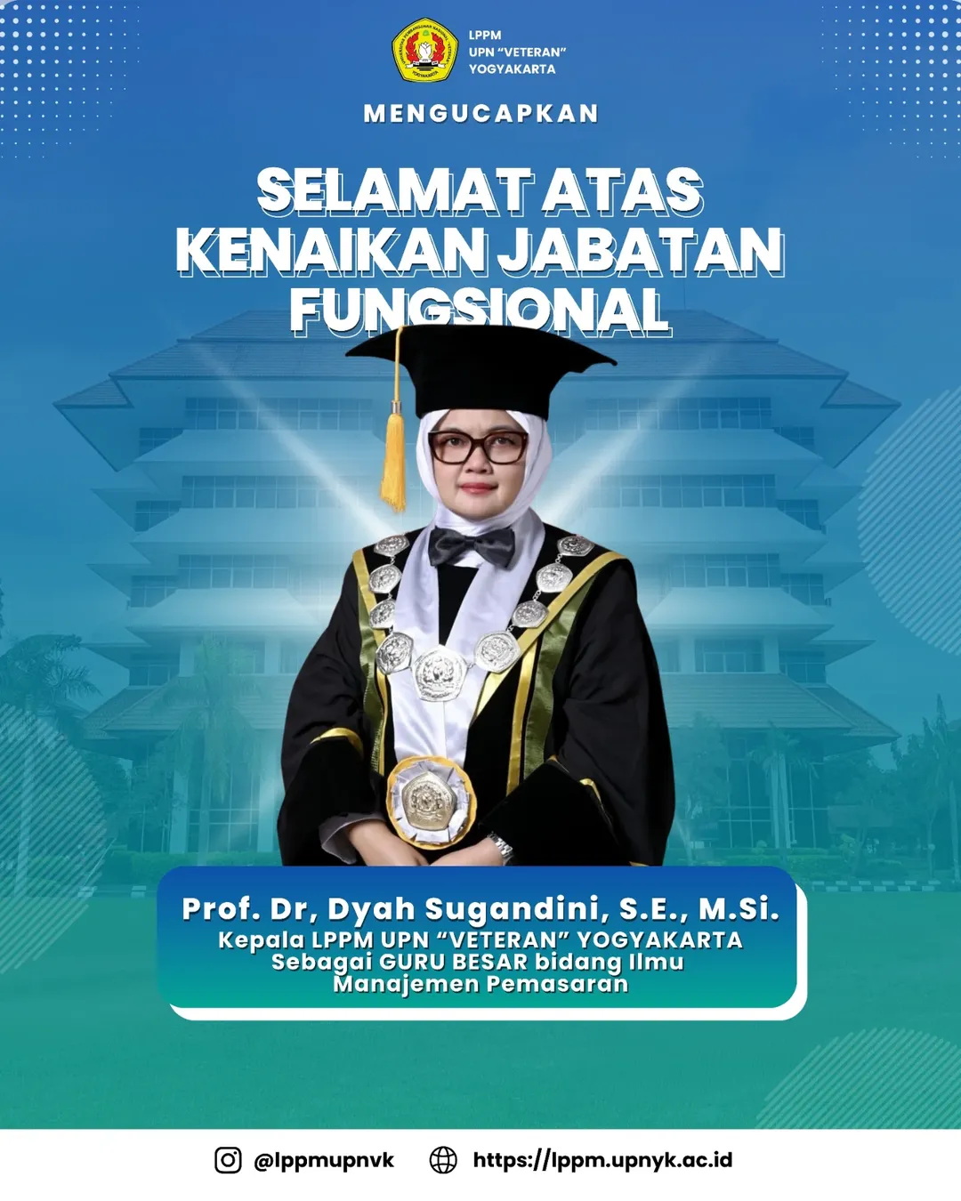 LPPM UPN “Veteran” Yogyakarta mengucapkan selamat dan sukses kepada Prof. Dr. Dyah Sugandini, S.E., M.Si. atas kenaikan jabatan sebagai Guru Besar bidang Ilmu Manajemen Pemasaran.